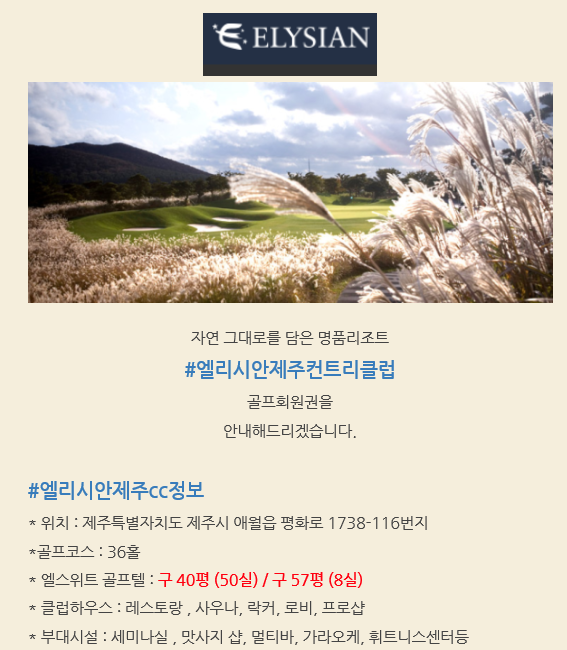 | 엘리시안cc회원권 제주엘리시안골프회원권 제주엘리시안골프골프텔회원권안내입니다. (0) | 2021.05.11 |