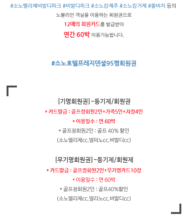 | #소노펠리체프레지덴셜95평회원권,소노빌리지95평회원권,쏠비치법인무기명회원권,소노펠리체법인무기명회원권안내입니다. (0) | 2021.04.06 |