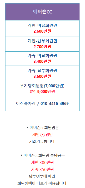 | 무기명회원권 에머슨CC회원권 에머슨CC개인회원권 에머슨CC가족회원권안내입니다. (0) | 2021.07.02 |