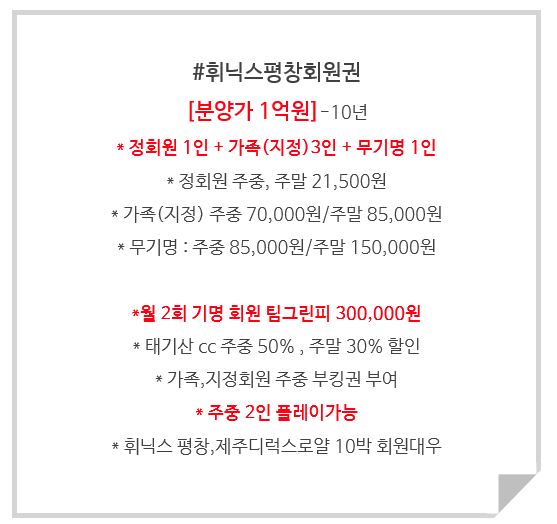 | 4인무기명회원권 , 팀그린피 회원권 휘닉스평창cc회원권 휘닉스cc골프회원권 안내입니다. (0) | 2021.05.13 |