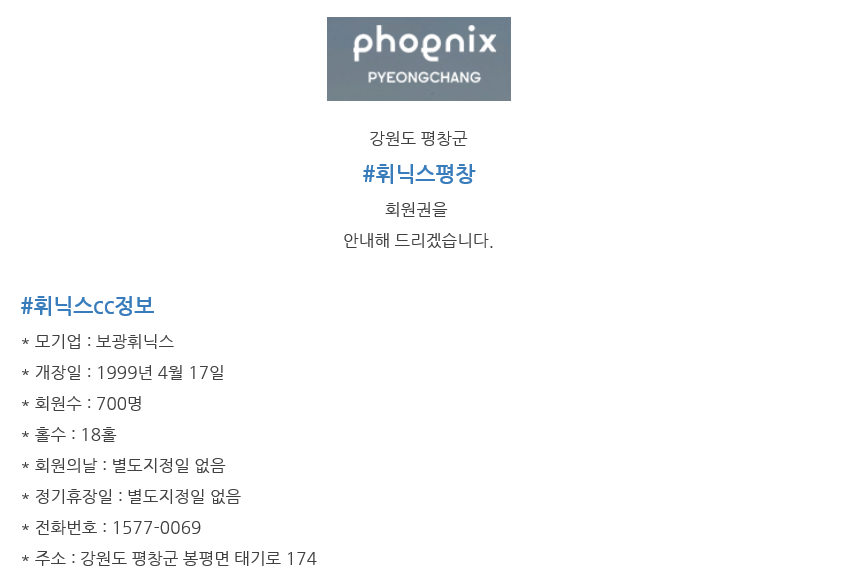 | 무기명회원권 팀그린피골프회원권 휘닉스평창회원권 휘닉스cc회원권안내입니다. (0) | 2021.06.28 |