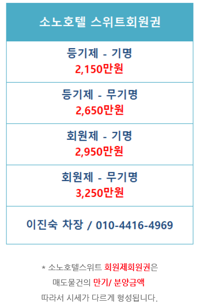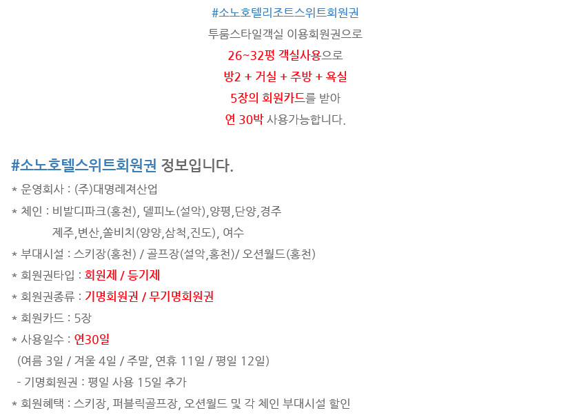 | *소노호텔스위트회원권,대명콘도투룸형회원권,소노호텔개인,법인무기명카드회원권혜택안내입니다. (0) | 2020.09.29 |