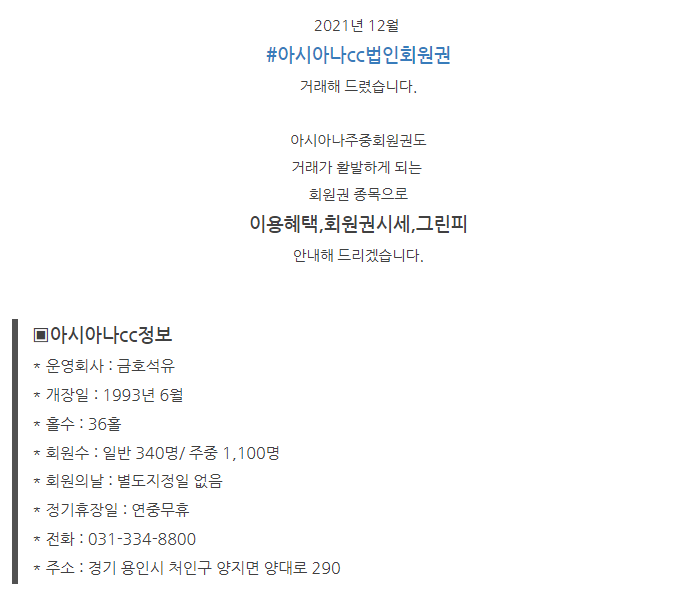 | 지산cc회원권,개인,법인,주중동반무기명혜택,거래방법안내!! (0) | 2022.02.03 |