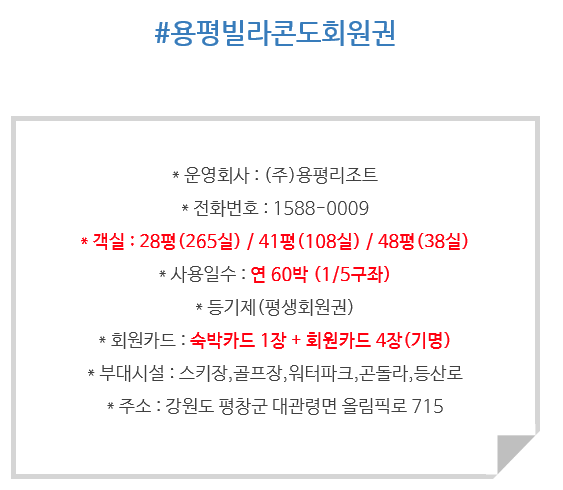 | #용평콘도회원권,용평콘도17평회원권,용평콘도34평회원권,용평콘도전용객실회원권안내입니다. (0) | 2021.03.31 |