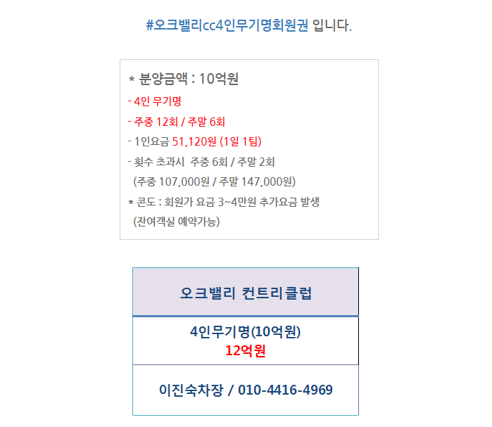*오크밸리cc4인무기명회원권/오크밸리컨트리클럽무기명골프회원권시세,회원권혜택안내입니다.