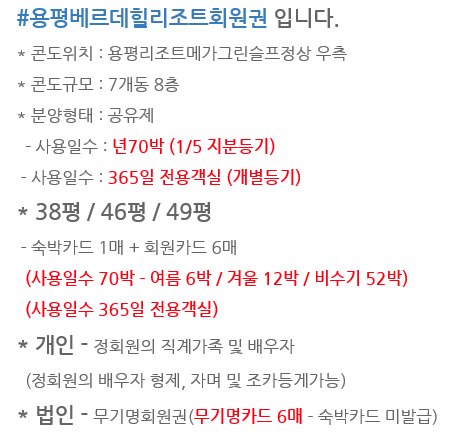 | *용평콘도17평,34평전용객실회원권,용평리조트365일전용객실회원권시세,회원권혜택안내입니다. (0) | 2020.08.04 |