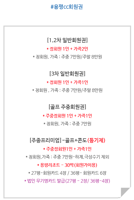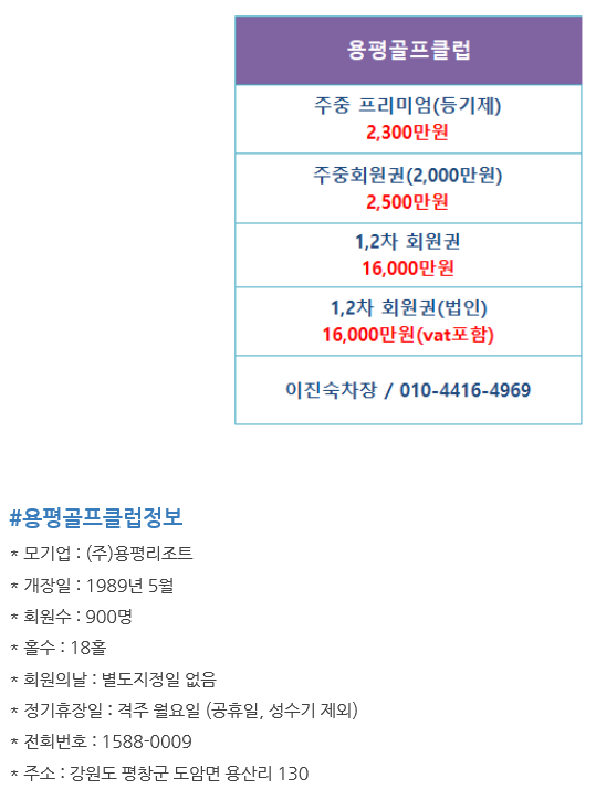골프회원권/강원권 *용평cc회원권,용평골프클럽회원권,용평cc법인회원권,용평cc회원권시세,용평cc회원권혜택안내입니다. by yesgolfyeoin 2021. 1. 26. 공유하기 게시글 관리 예스회원권 '골프회원권 > 강원권' 카테고리의 다른 글 #오크밸리CC회원권,오크밸리CC골프회원권,오크밸리CC주중회원권,오크밸리법인회원권,오크밸리CC무기명회원권안내입니다. (0) 2021.03.25 #4인무기명,오크힐스cc회원권,오크힐스cc무기명회원권,법인4인무기명회원권시세,오크힐스cc4인무기명회원권안내입니다. (0) 2021.02.18 *버치힐cc골프회원권,용평버치힐cc회원권,용평버치힐골프회원권,용평버치힐cc회원권시세,용평버치힐cc무기명회원권,용평버치힐골프회원권시세안내입니다. (0) 2020.12.11 *용평cc회원권,용평cc골프회원권,용평cc법인회원권,용평cc주중회원권, 용평골프클럽회원권시세안내입니다. (0) 2020.12.11 *용평cc회원권,용평골프회원권시세,용평cc법인회원권,용평cc회원권시세,용평컨트리클럽회원권혜택안내입니다. (0) 2020.12.08 관련글 #오크밸리CC회원권,오크밸리CC골프회원권,오크밸리CC주중회원권,오크밸리법인회원권,오크밸리CC무기명회원권안내입니다. #4인무기명,오크힐스cc회원권,오크힐스cc무기명회원권,법인4인무기명회원권시세,오크힐스cc4인무기명회원권안내입니다. *버치힐cc골프회원권,용평버치힐cc회원권,용평버치힐골프회원권,용평버치힐cc회원권시세,용평버치힐cc무기명회원권,용평버치힐골프회원권시세안내입니다. *용평cc회원권,용평cc골프회원권,용평cc법인회원권,용평cc주중회원권, 용평골프클럽회원권시세안내입니다.