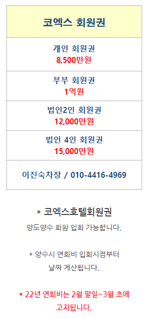 | 인터컨티넨탈코엑스회원권 개인,법인거래방법,연회비 (0) | 2022.02.15 |