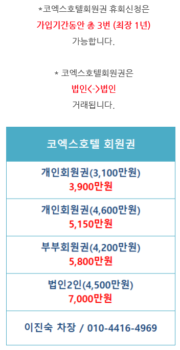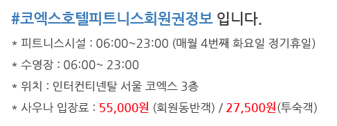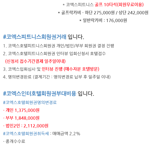 | *코엑스인터컨티넨탈서울개인,법인,부부피트니스회원권 코엑스코스모폴리탄2020년연회비,회원권시세안내입니다. (0) | 2020.07.14 |