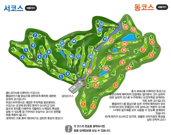36홀 코스를 회원제로 운영하고 있으며 각 홀 마다 레이크와 벙커를 배치하고 있어