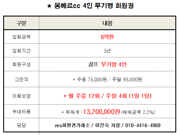 * 몽베르cc무기명 회원권 만기 5년 / 시중 양도, 양수 가능합니다.