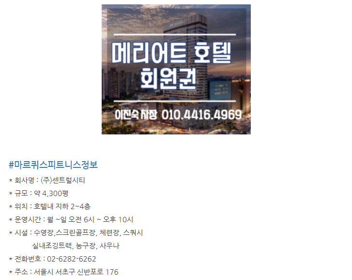| 반포메리어트휘트니스회원권 메리어트회원권가격안내입니다. (0) | 2021.11.25 |